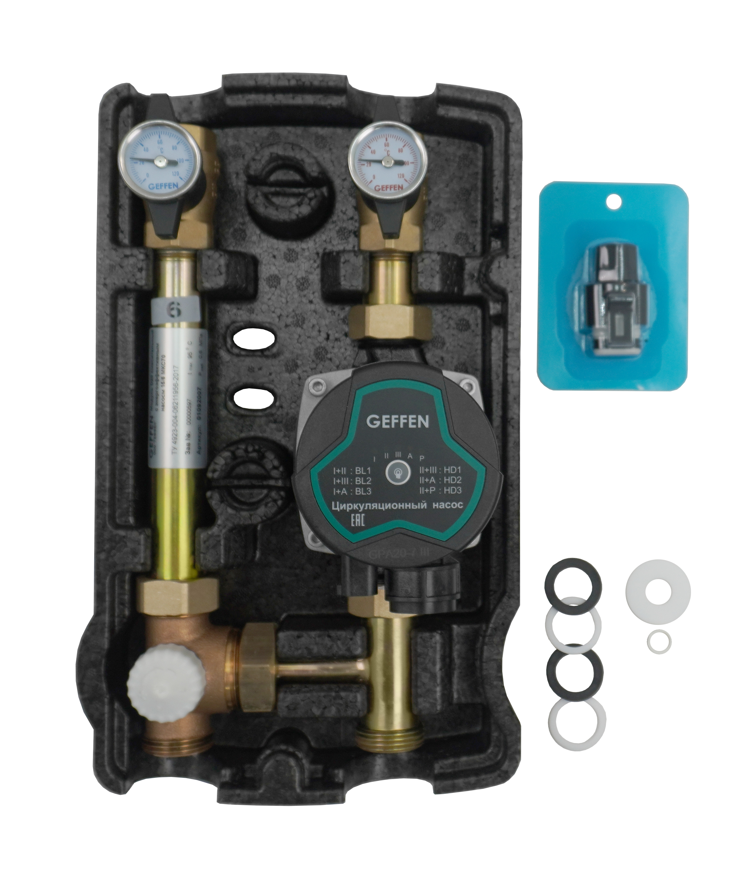 Модуль смесительный с насосом обеспечивает циркуляцию теплоносителя в системе. Насосы размещаются на подающей линии прямого отопительного контура. Трехходовой клапан обеспечивает необходимую температуру теплоносителя.